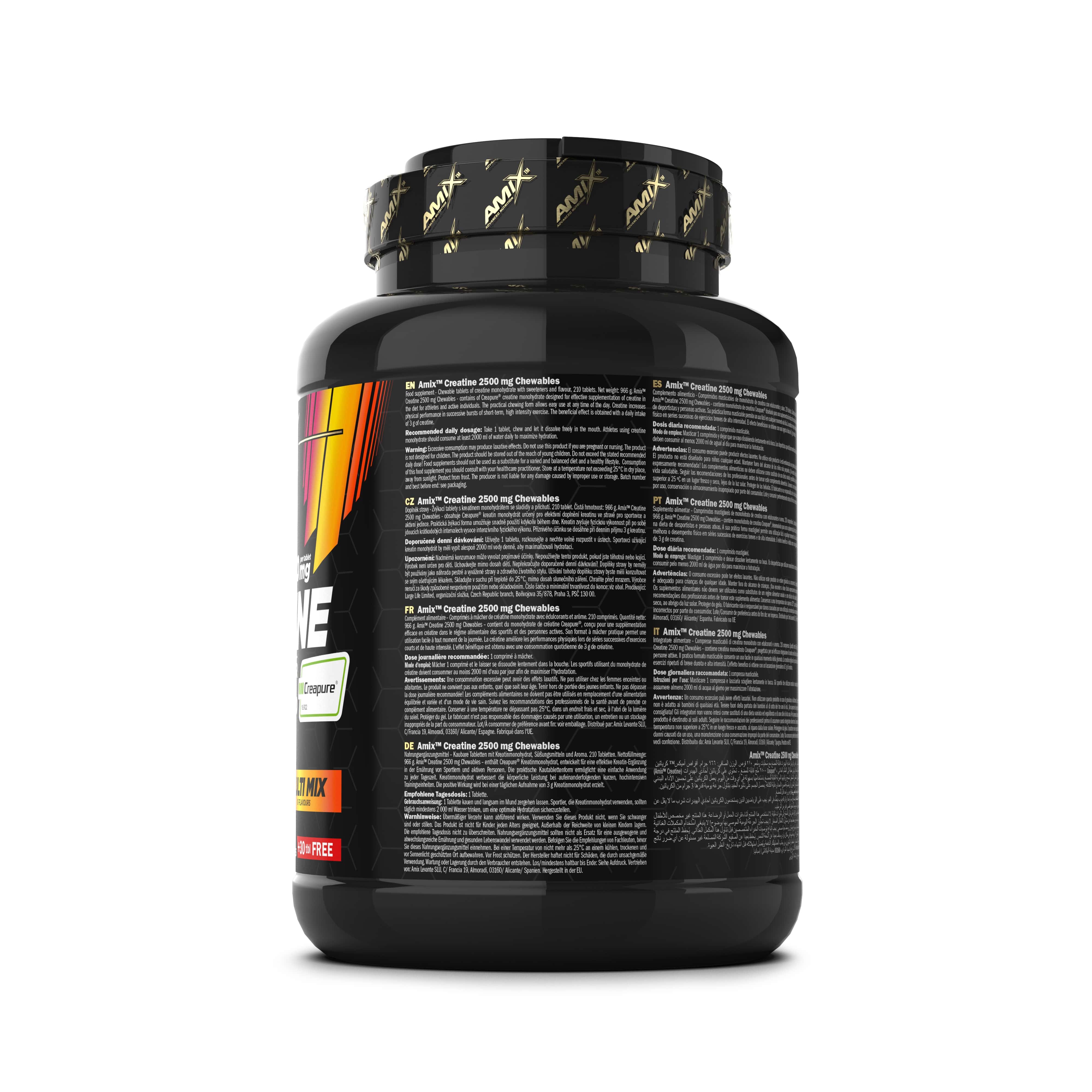 Amix™ Creatine 2500 mg Chewables - obsahuje Creapure® kreatin monohydrát určený pro efektivní doplnění kreatinu ve stravě pro sportovce a aktivní jedince. Praktická žvýkací forma umožňuje snadné použití kdykoliv během dne. Kreatin zvyšuje fyzickou výkonnost při po sobě jdoucích krátkodobých intervalech vysoce intenzivního fyzického výkonu. Příznivého účinku se dosáhne při denním příjmu 3 g kreatinu.